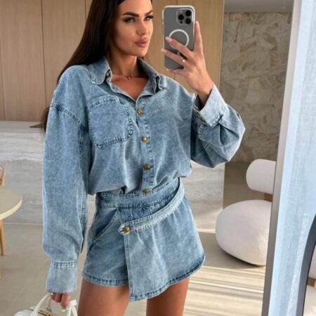 zł 189,00Odkryj nasz wyjątkowy denimowy komplet, który łączy w sobie elegancję i wygodę. Składa się z koszuli i stylowych spódnico-spodenek, które będą doskonałym wyborem na różnorodne okazje. ### Koszula: – Wykonana z cieńszego jeansu, który zapewnia komfort noszenia. – Elegancki kołnierz dodaje szyku i klasy. – Kieszeń na wysokości biustu idealnie […]
