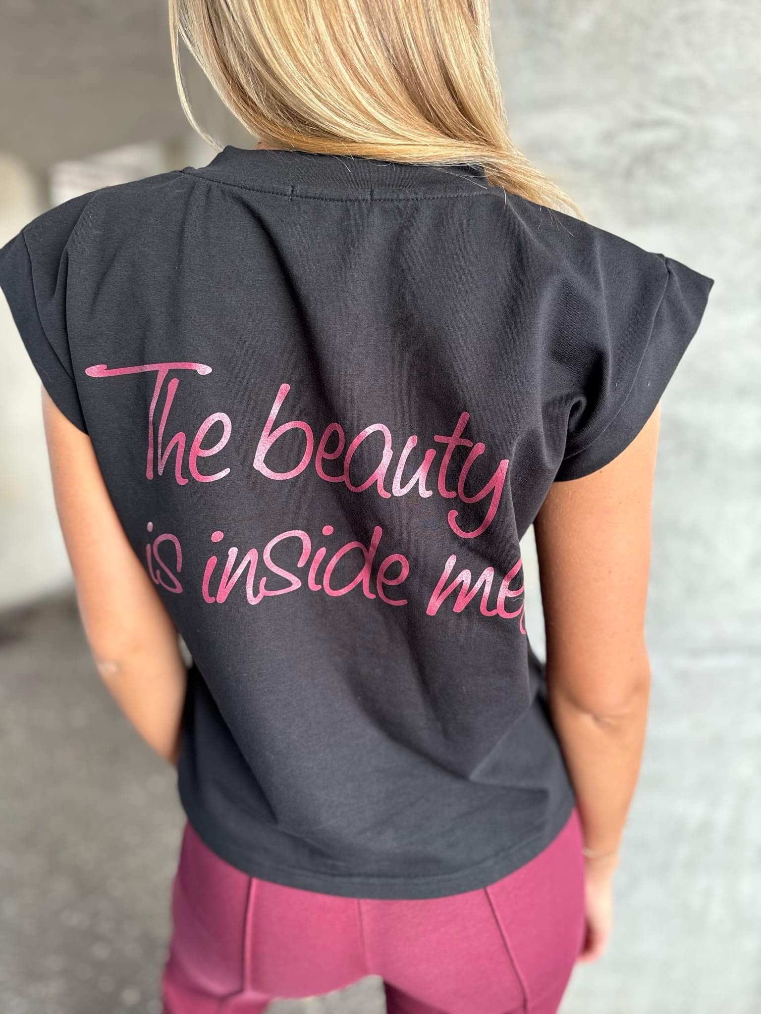Z tyłu bluzka zdobiona jest stylowym napisem, co nadaje jej wyjątkowy charakter. Idealne zarówno do spodni, jak i spódnic – pozwól, aby Twój styl błyszczał!