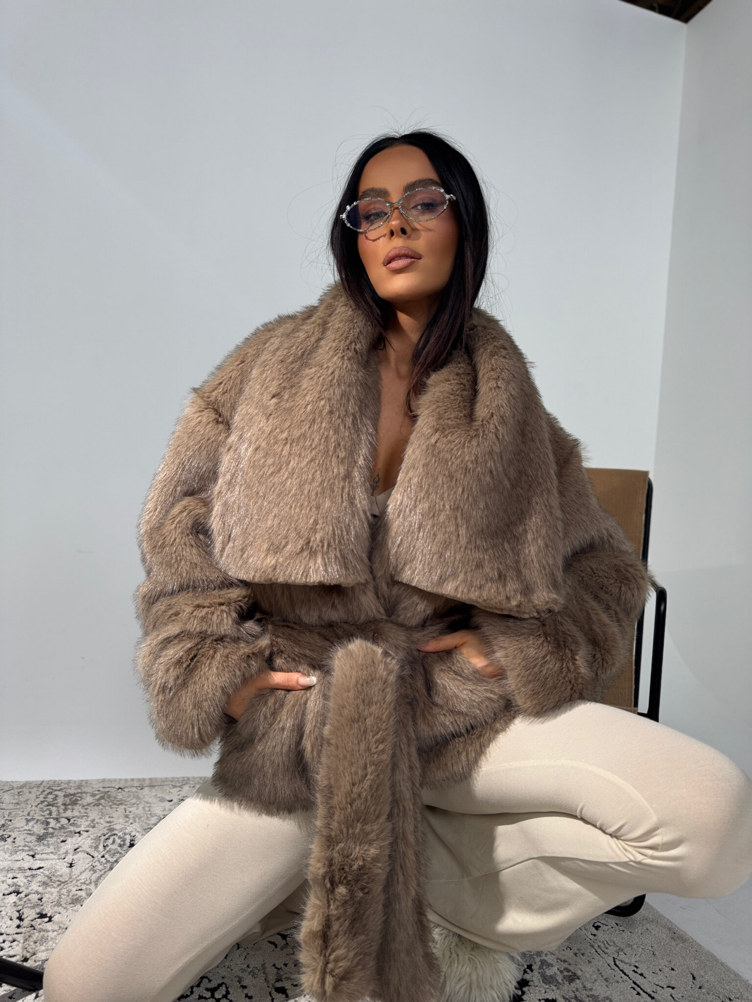Wyjątkowe futro o luksusowym wyglądzie i kobiecej formie. Mięsista, gęsta tkanina imitująca naturalne futro nadaje całości elegancji, a przy tym skutecznie chroni przed chłodem. Model z obszernym kołnierzem, lekko opuszczoną linią ramion i wiązaniem w pasie, które pięknie podkreśla sylwetkę. Długość do bioder sprawia, że pasuje zarówno do spodni, jak i sukienek. Wygodne, wsuwane rękawy i przemyślany krój zapewniają komfort noszenia i modowy efekt bez wysiłku. Must-have sezonu dla kobiet, które cenią styl, wygodę i jakość wykonania.Skład: 100% poliester