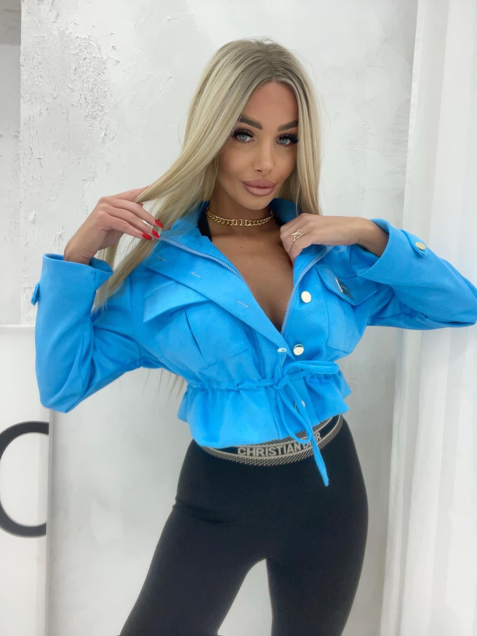 – **Fason:** Krótki fason na podszewce z efektownymi pagonami na ramionach.