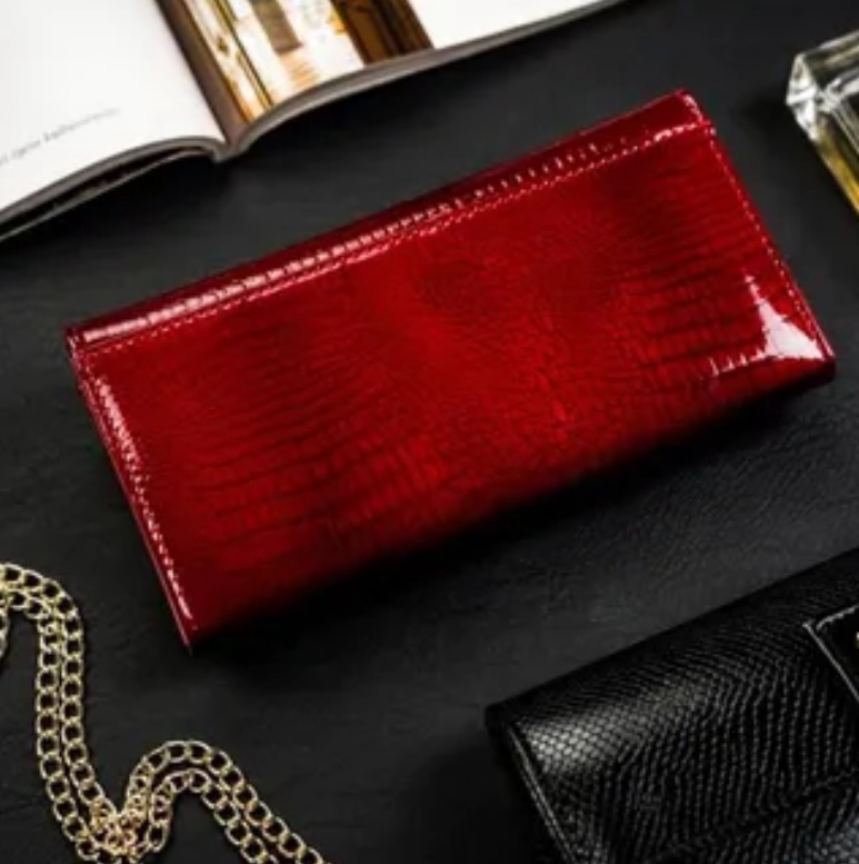 Uszyty z wysokogatunkowej skóry naturalnej z eleganckim wzorem imitującym skórę krokodyla, ten portfel jest idealnym połączeniem stylu i funkcjonalności. Jego poziomy design i praktyczne zamknięcie klapką na zatrzask sprawiają, że korzystanie z niego to czysta przyjemność.
