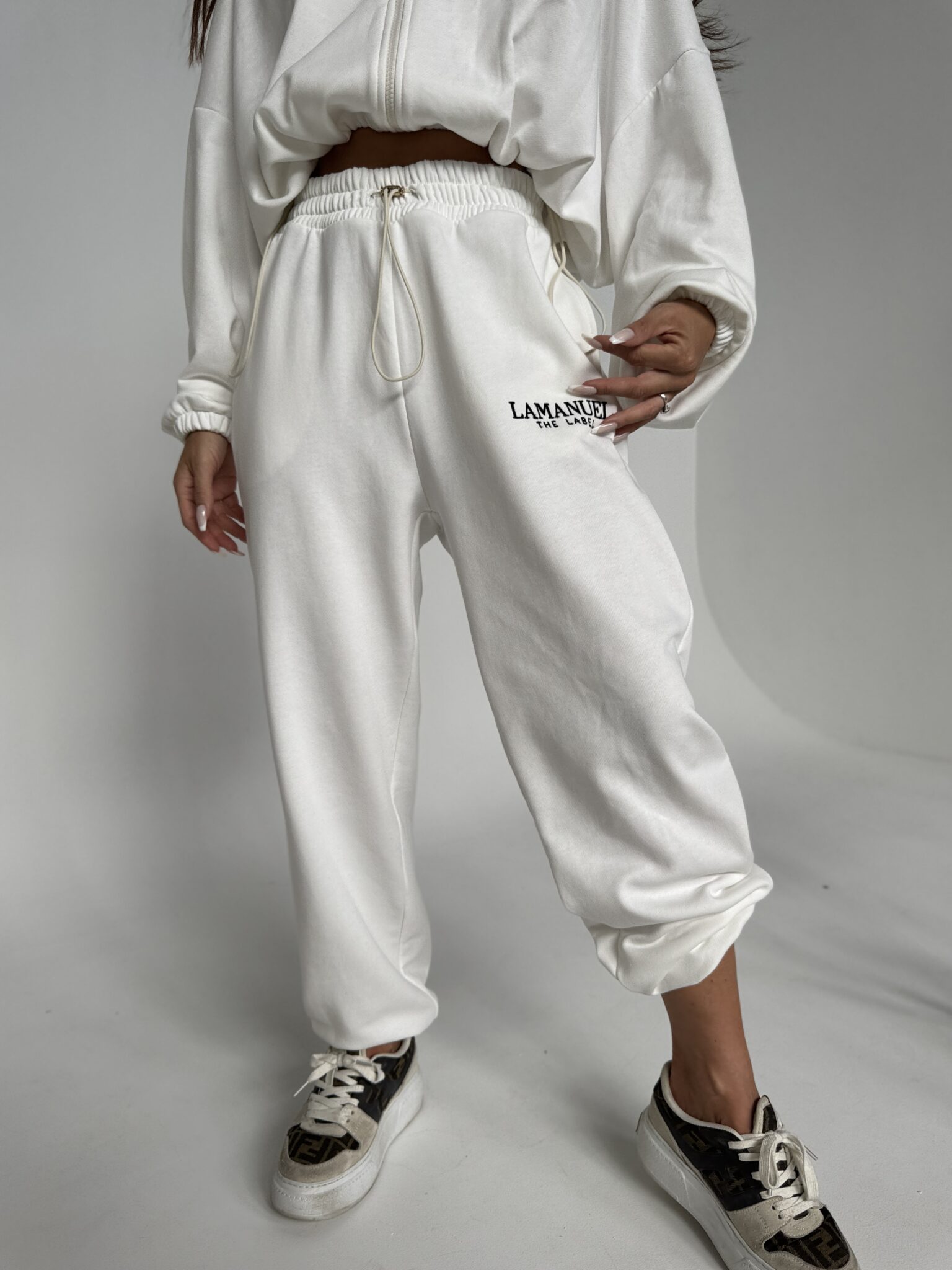 Szerokie spodnie dresowe, stylizowane na męskie z wysokim stanem i elastyczną gumką w pasie oraz dodatkowym troczkiem do regulacji. Szeroka, prosta nogawka i wygodny krój zapewniają komfort noszenia i swobodę ruchów. Na biodrze widoczne logo LAMANUEL, które spójnie komponuje się z bluza CLOUDY. tworząc kompletny, modny zestaw. Spodnie mimo, że są szerokie pasują idealnie od rozmiaru XS-L.Skład: 90% bawełna 10% poliester