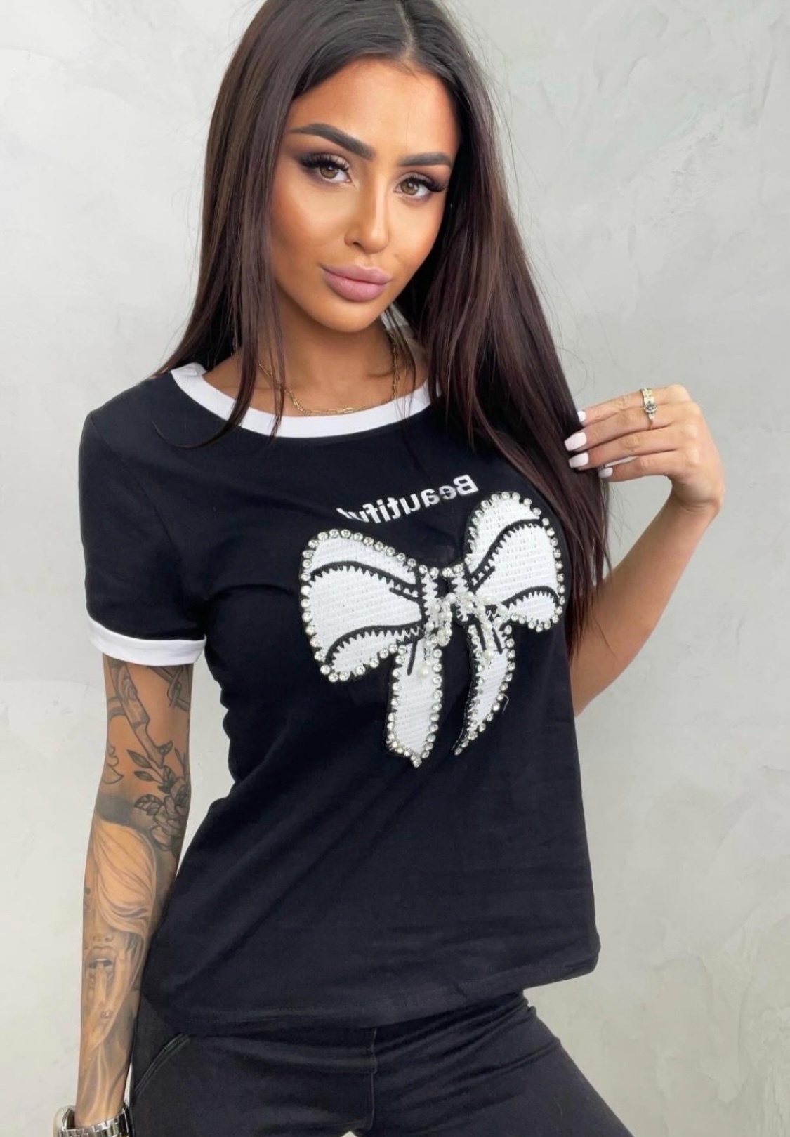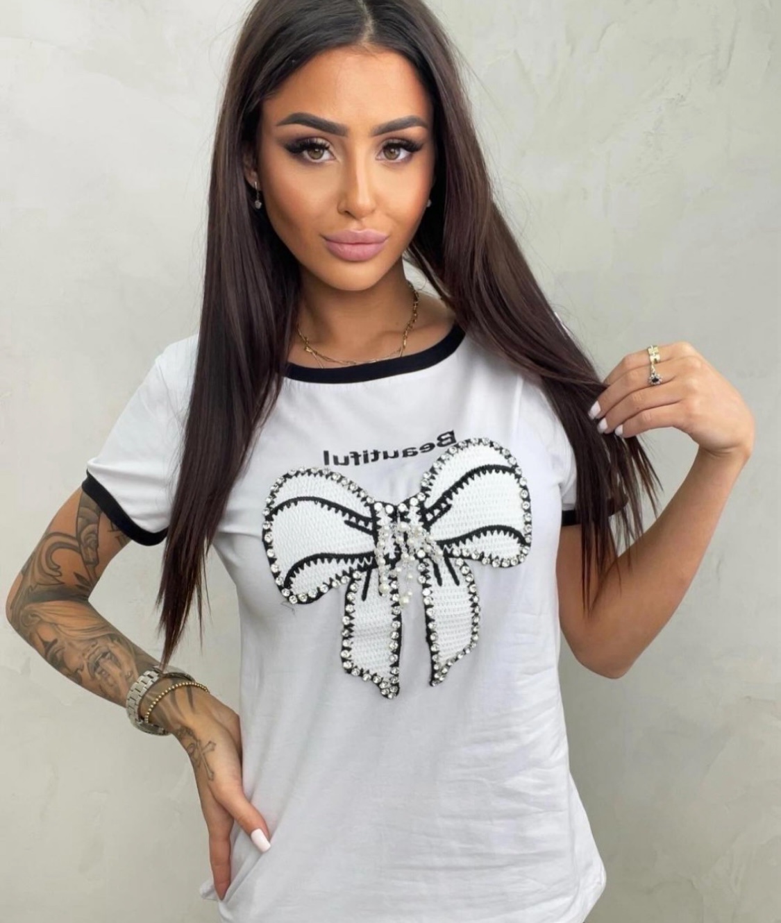 Wprowadź odrobinę uroku do swojej garderoby z naszym t-shirtem ozdobionym napisem “beautiful” oraz efektowną kokardą zdobioną cyrkoniami i perłami. Ten wyjątkowy model to idealny wybór dla każdej kobiety, która pragnie wyrazić swój styl w elegancki sposób.